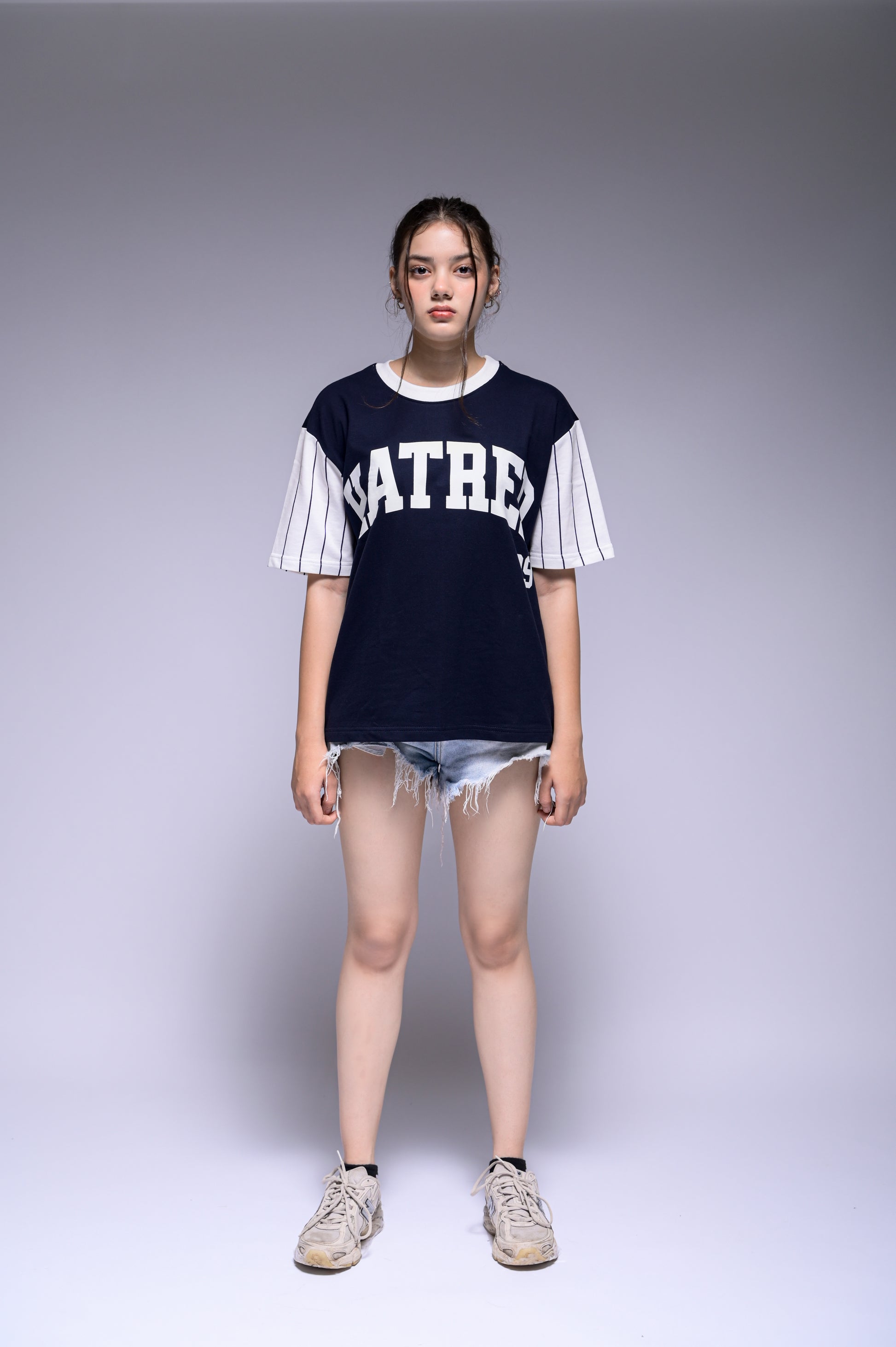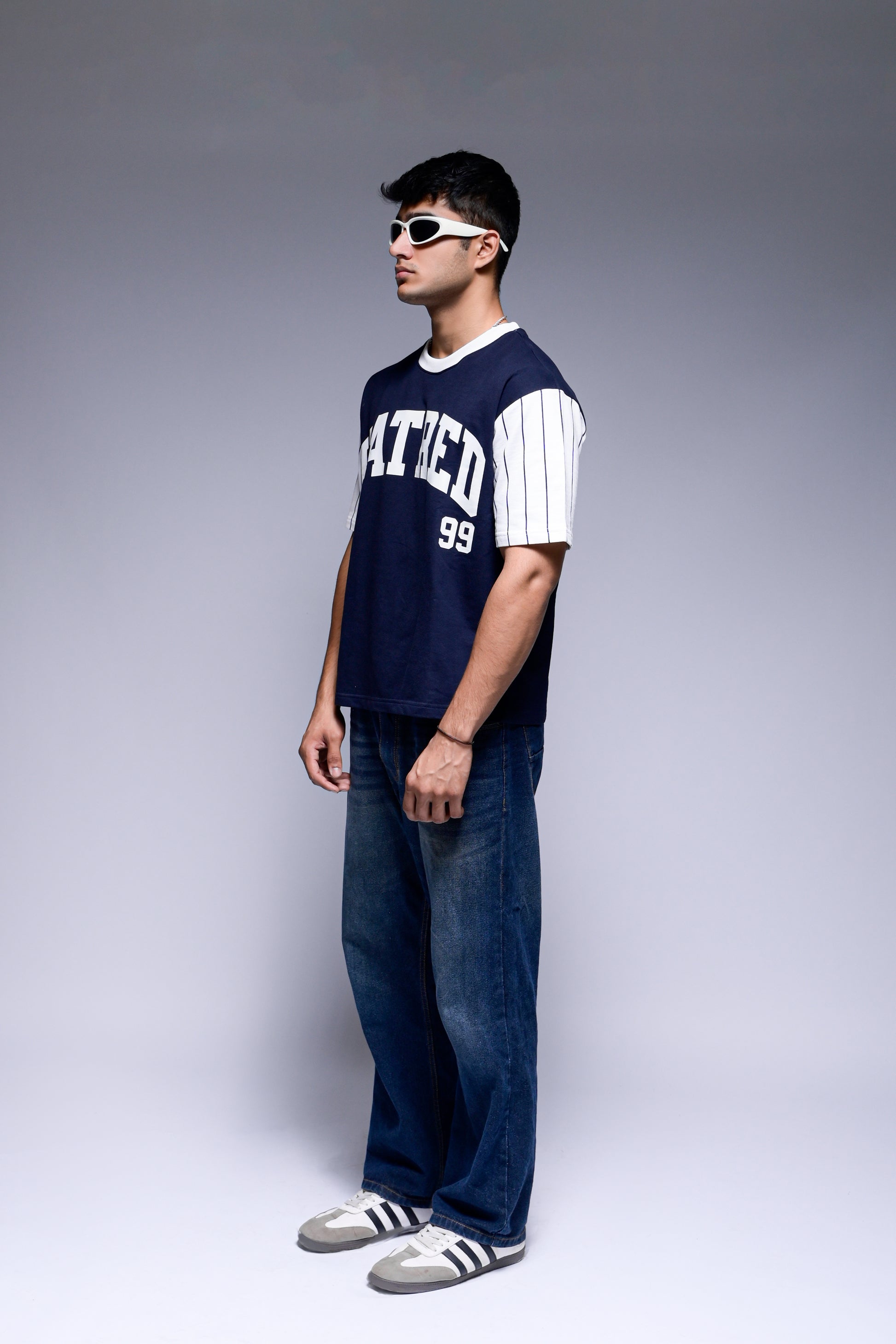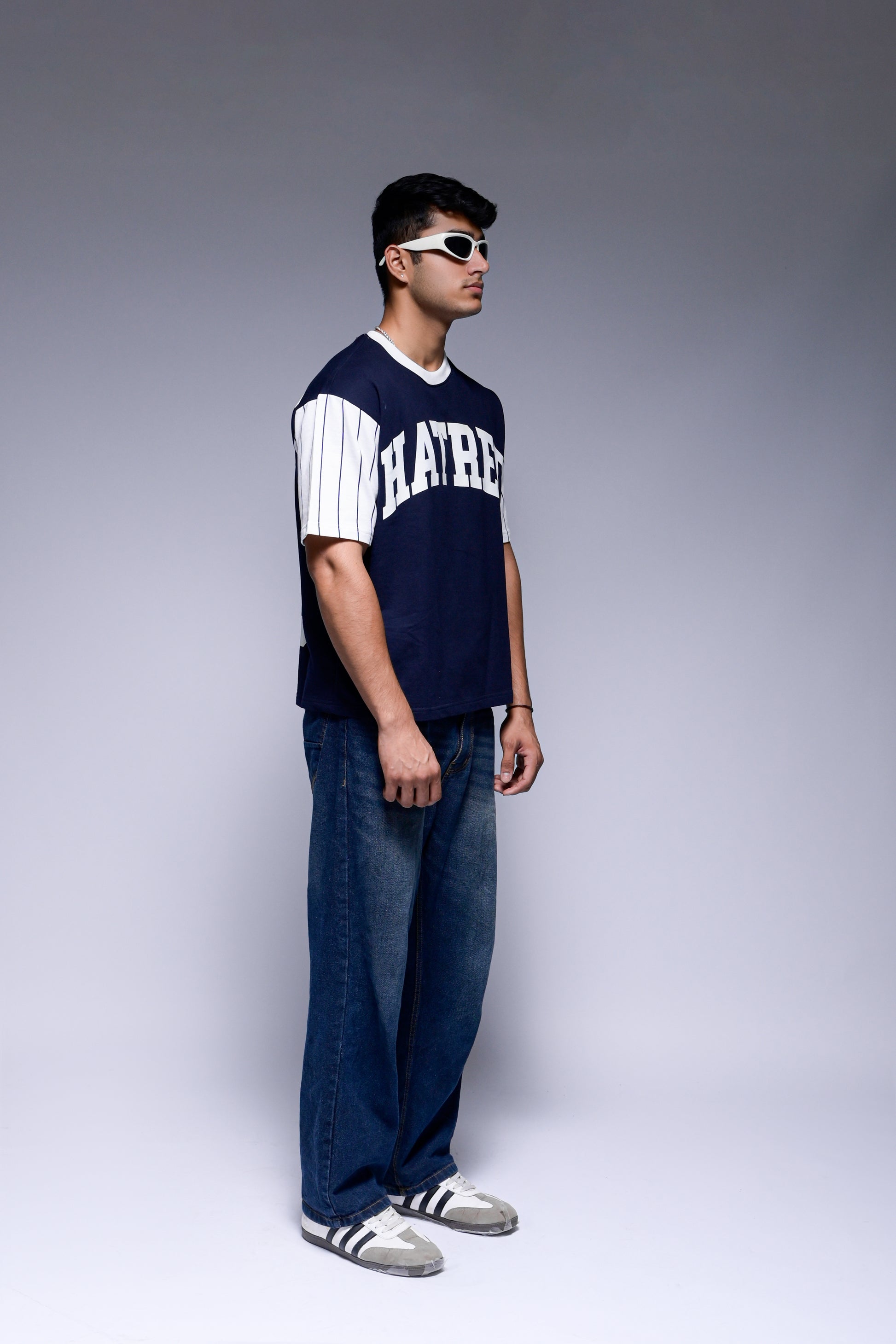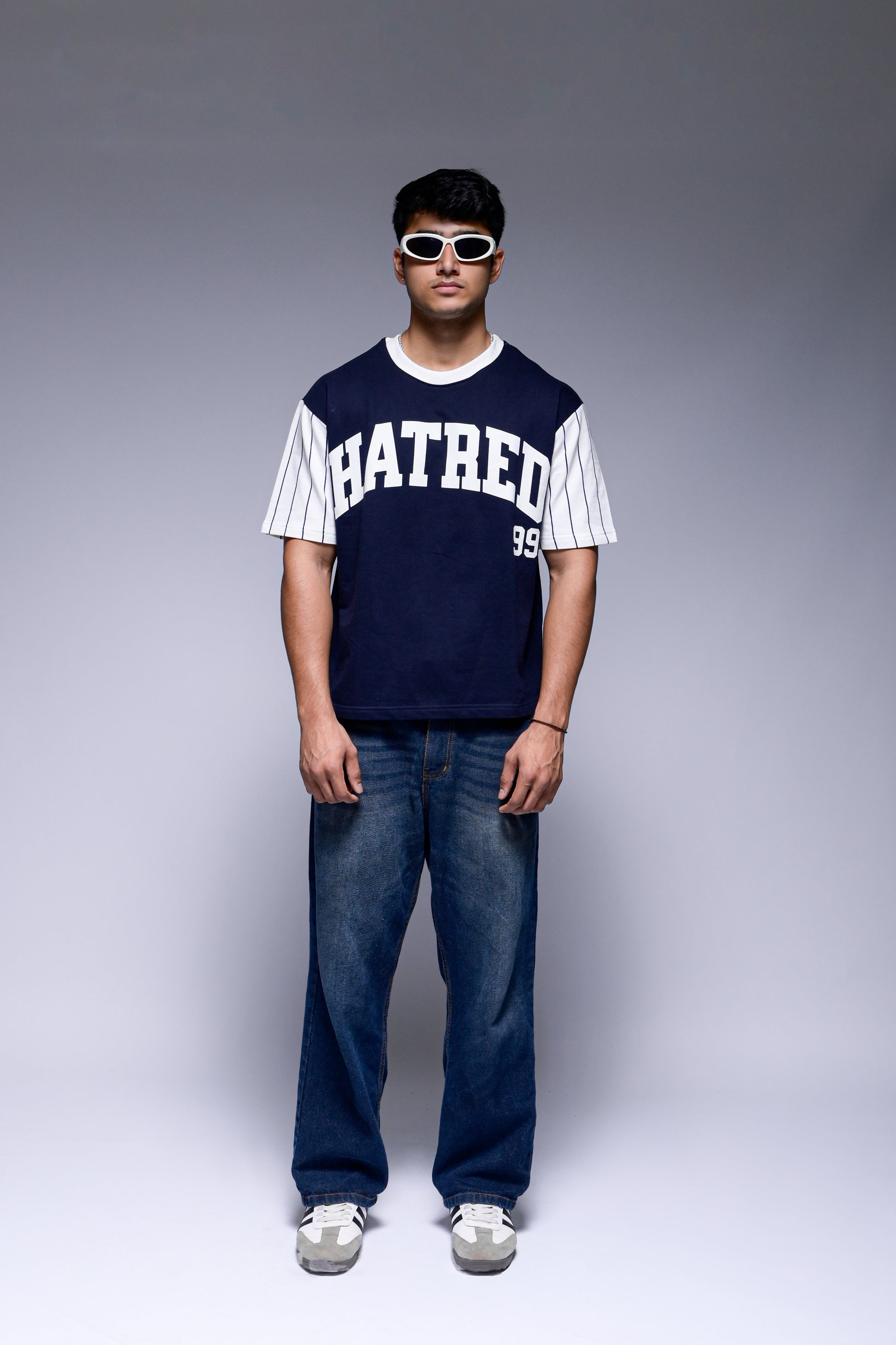 The Hatred Tee in navy blue and white is made from 100% terry cotton with a durable 240gsm weight. It features a loose, boxy, and cropped fit, delivering bold style and all-day comfort for a standout streetwear look.