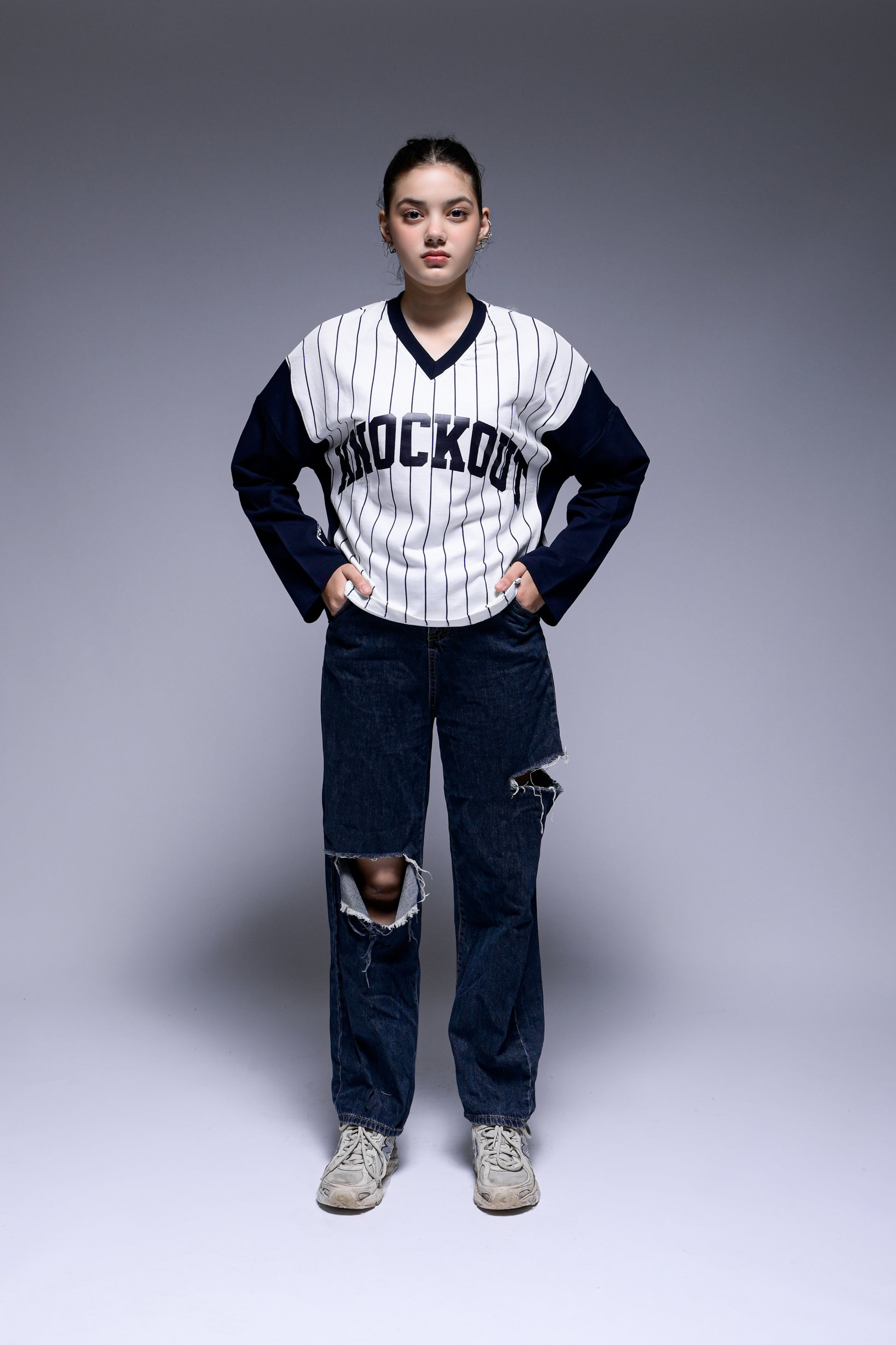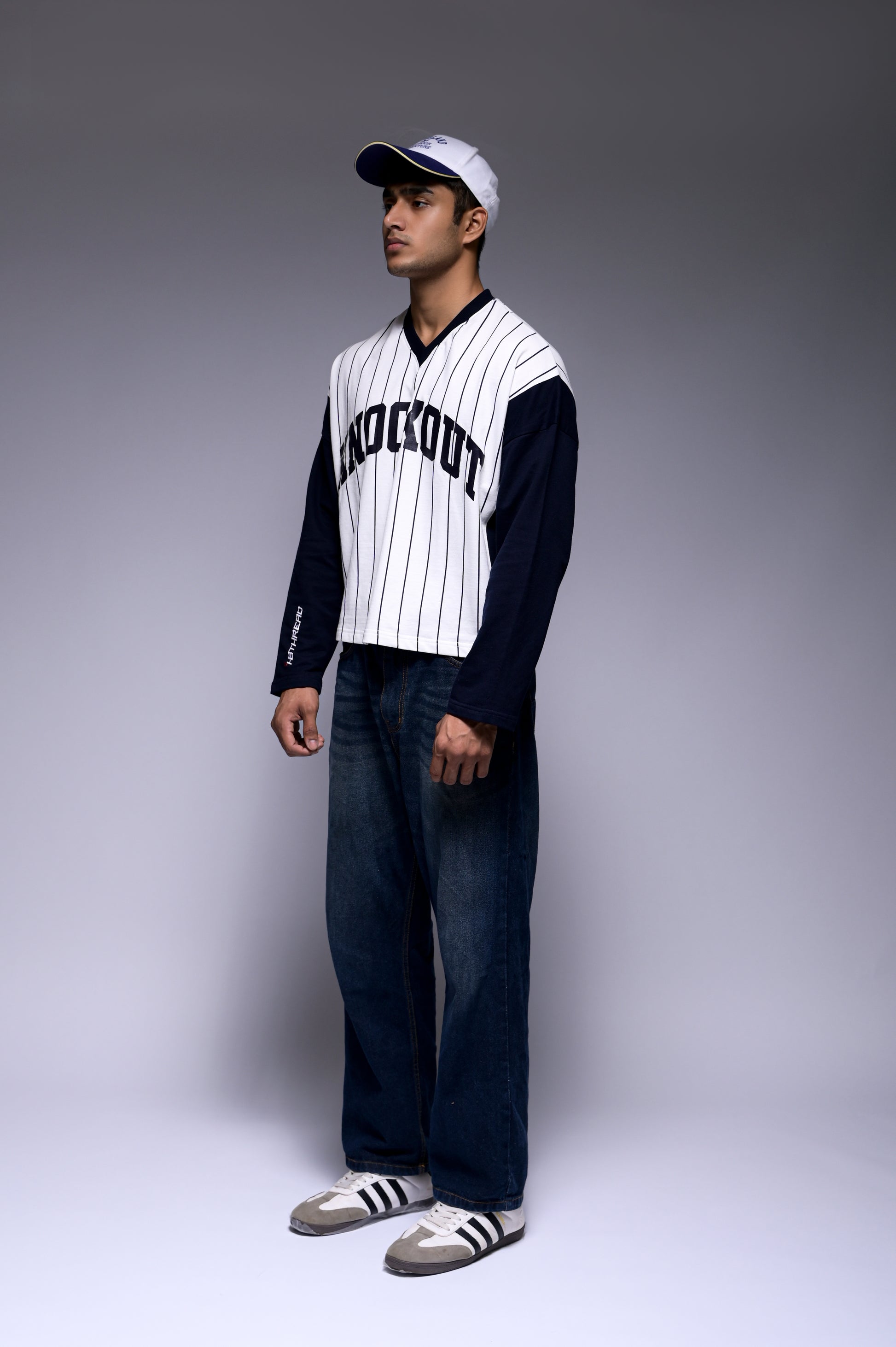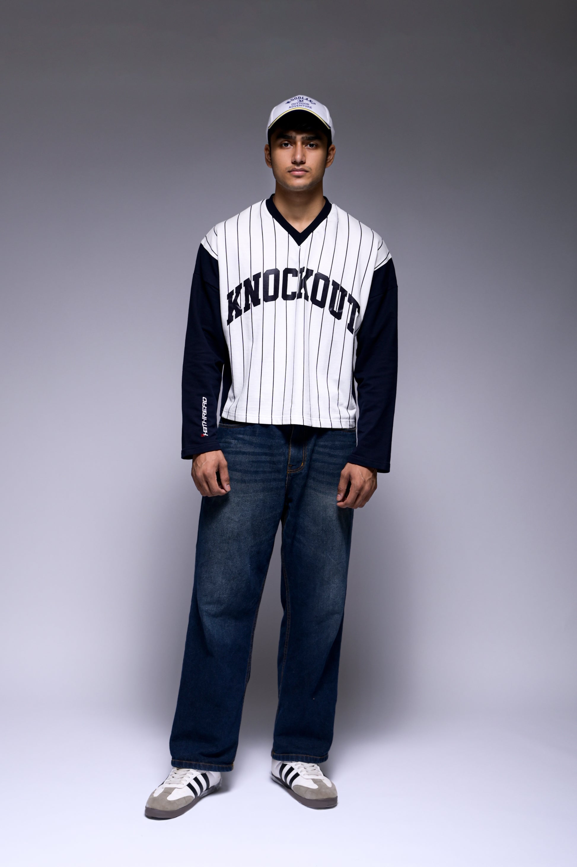 The Knockout Tee in navy blue and white is crafted from 100% terry cotton with a sturdy 240gsm weight. It features a baggy, boxy, and cropped fit for a bold, comfortable streetwear look.