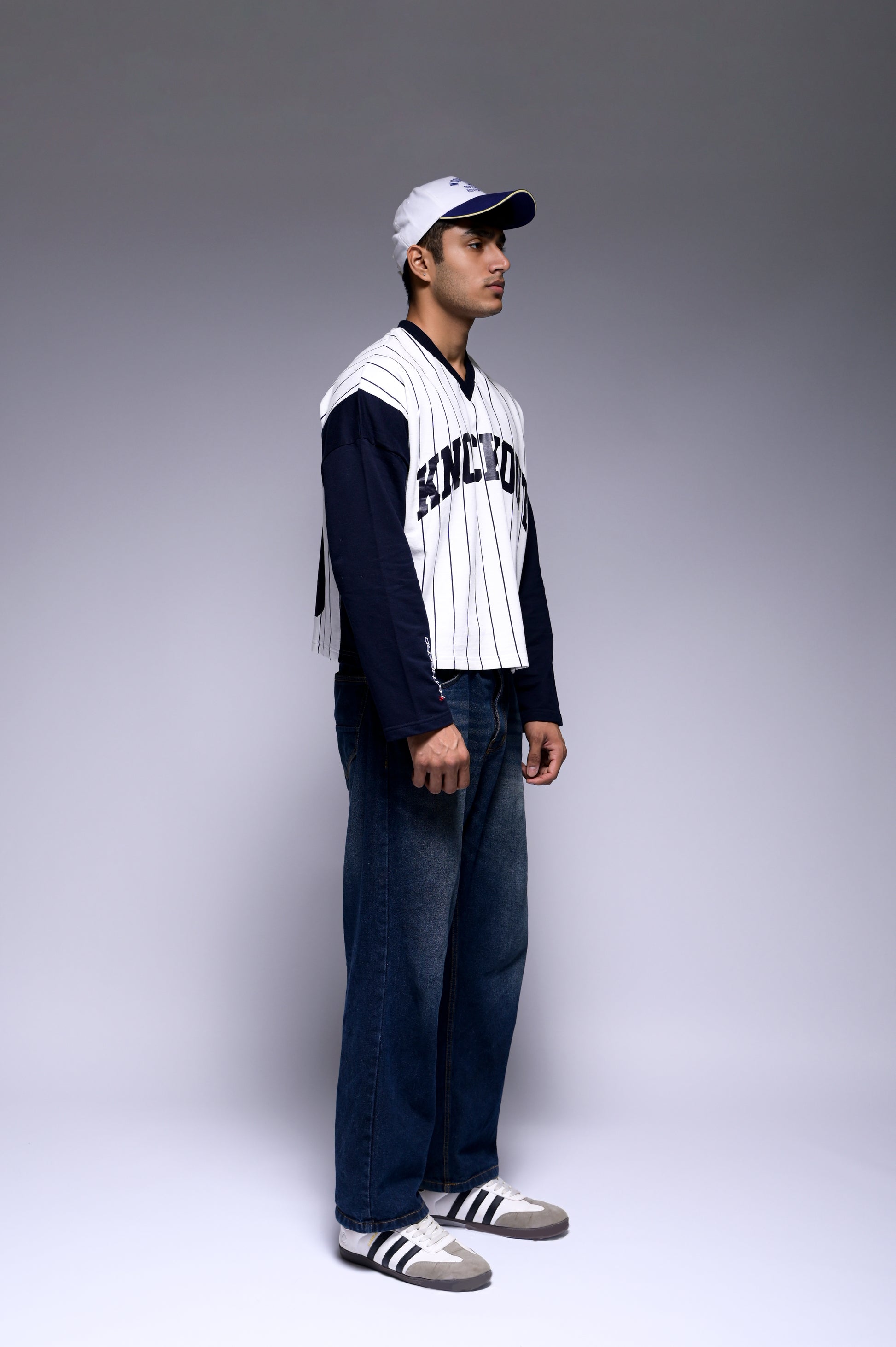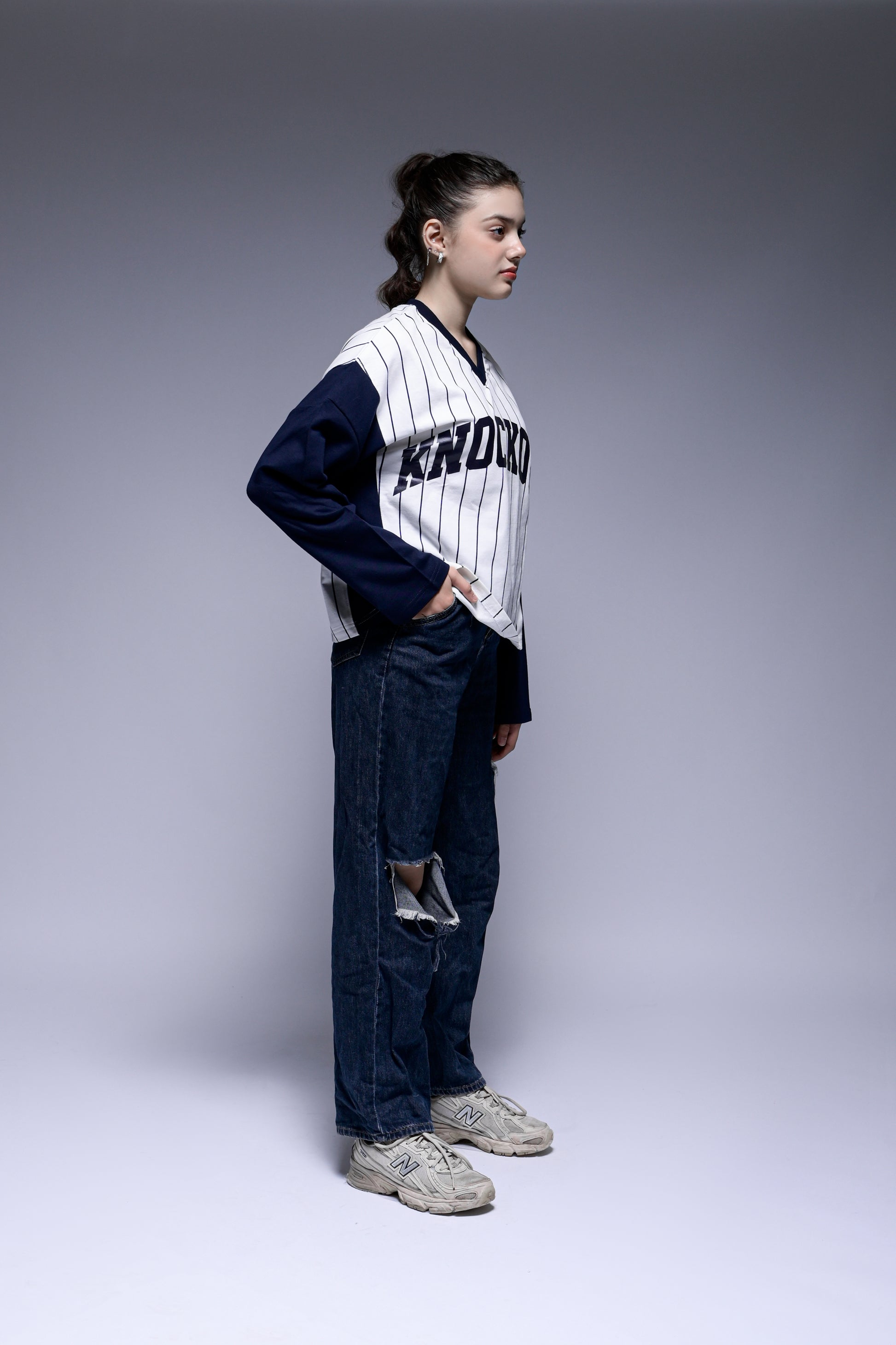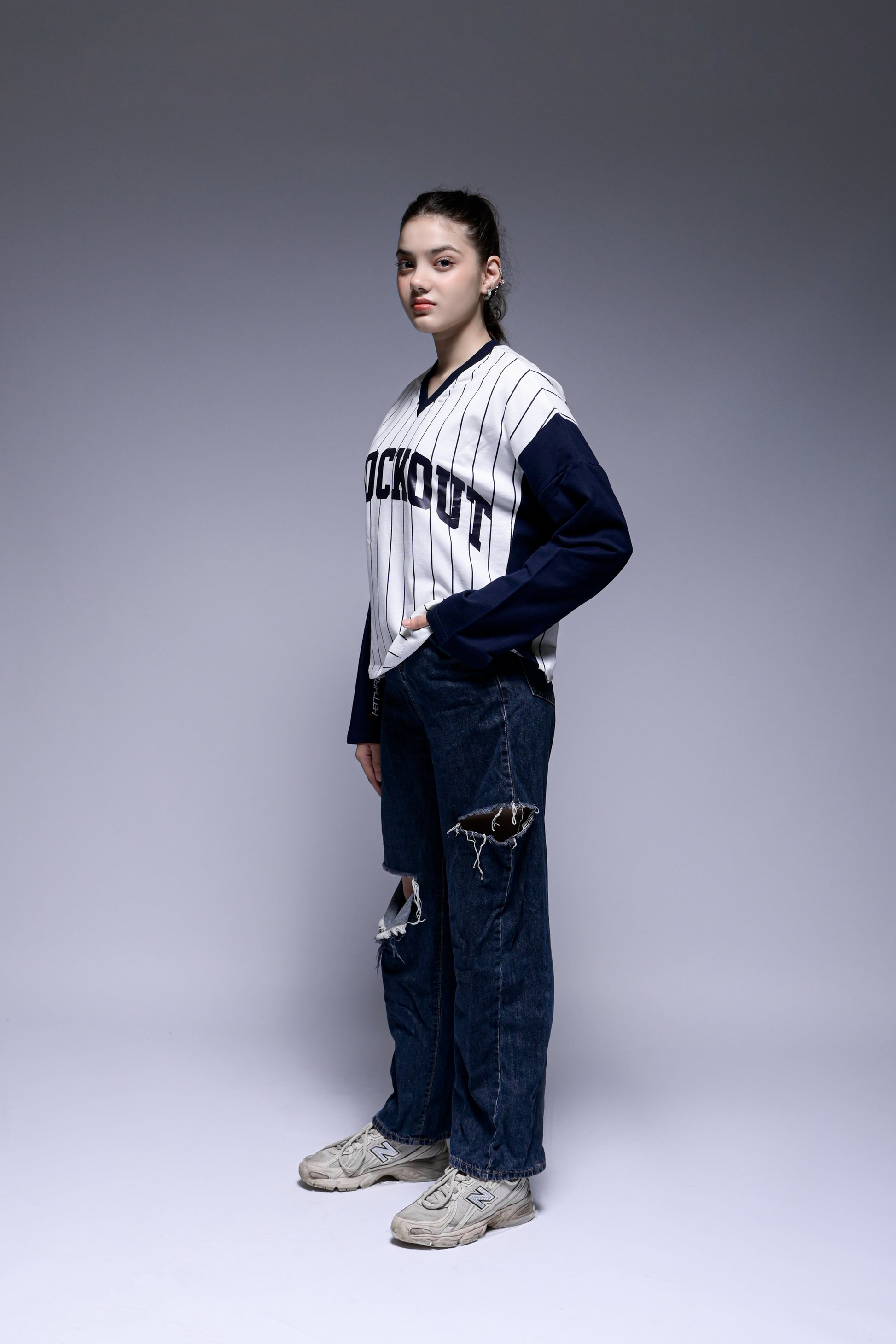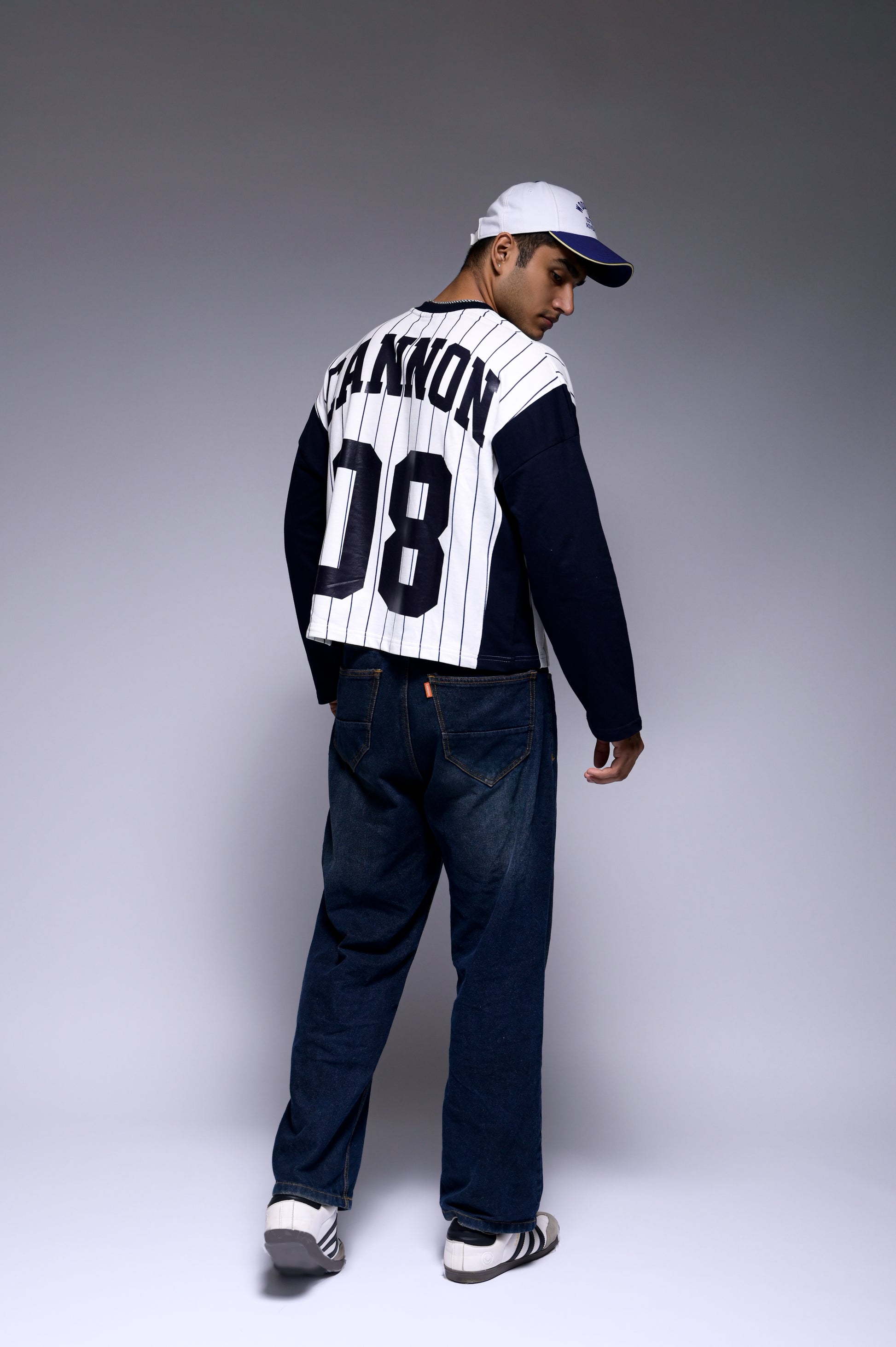 The Knockout Tee in navy blue and white is crafted from 100% terry cotton with a sturdy 240gsm weight. It features a baggy, boxy, and cropped fit for a bold, comfortable streetwear look.