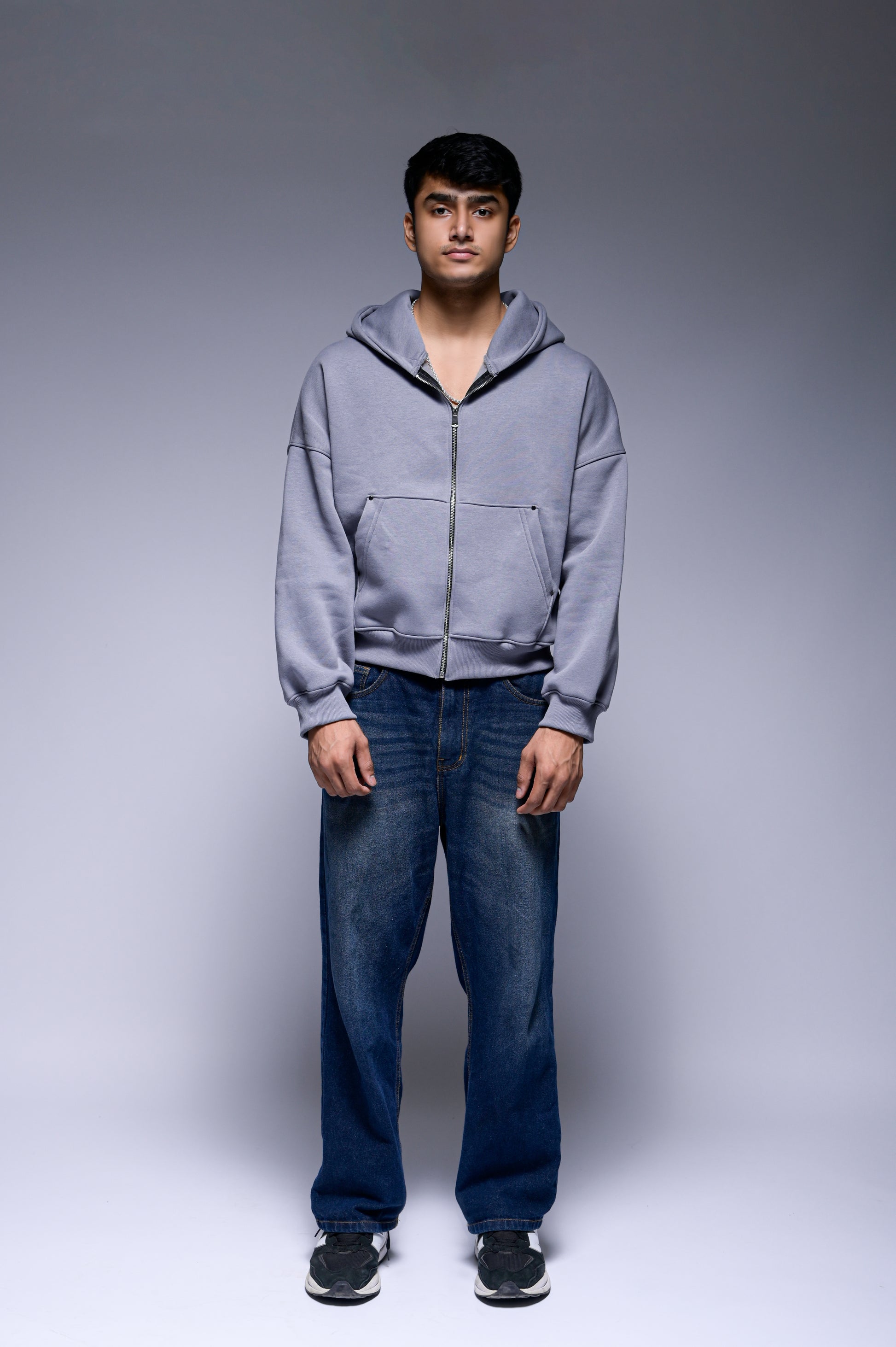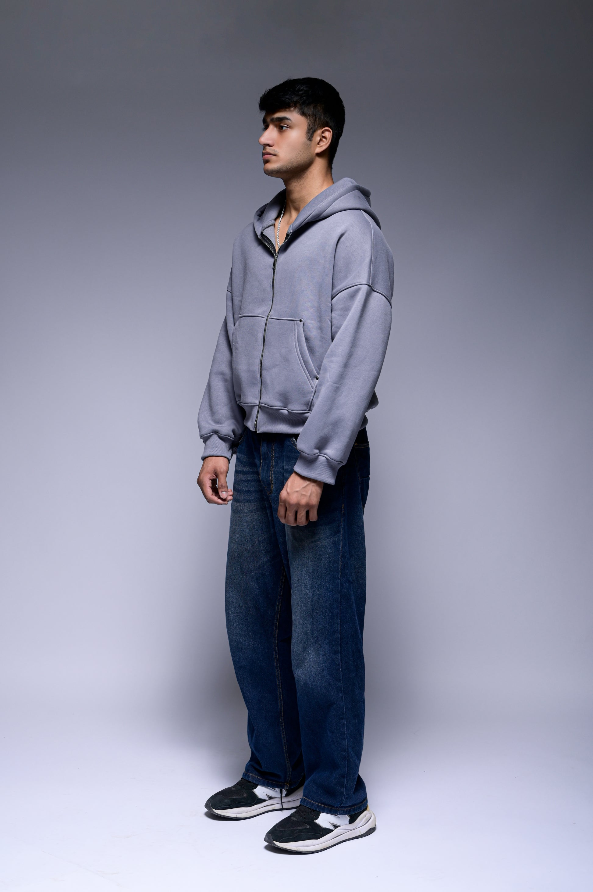 The Stressed Jacket in dark grey is made from 100% fleece with a durable 340gsm weight. The back features distressed embroidery, adding a unique textured effect. It has a baggy, boxy, and cropped fit, combining bold style with all-day comfort for a standout streetwear vibe.